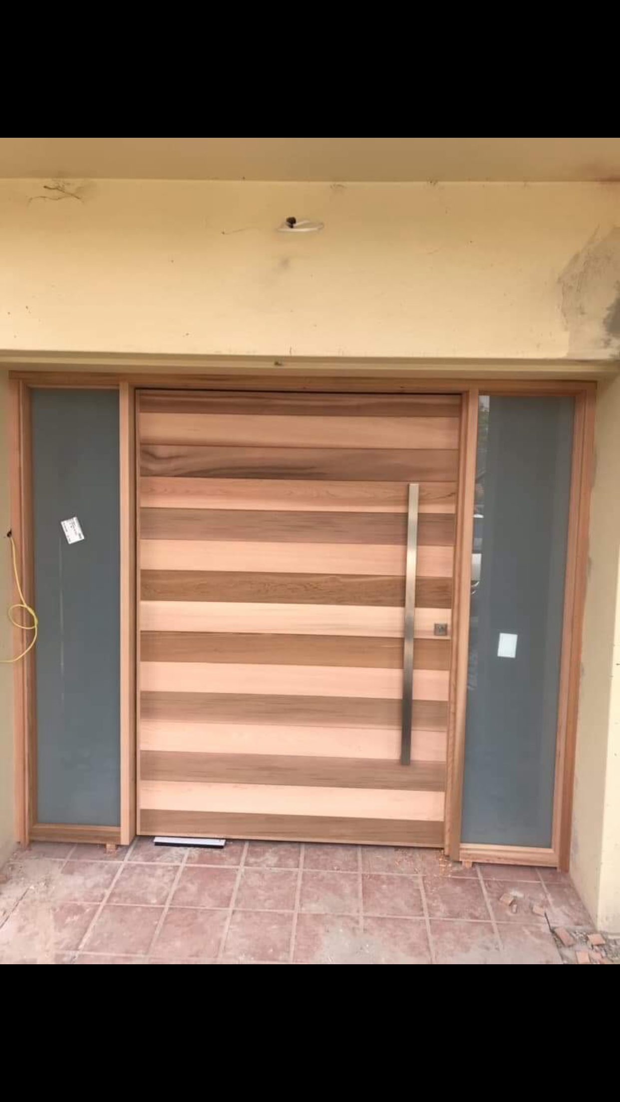 A horizontal Cedar clad door